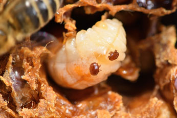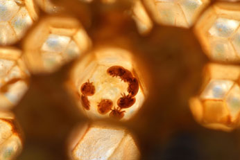 - Varroa Milben vermehren sich in den verdeckelten Brutzellen der Bienen. Hierzu legt die Varroamilbe ein Ei in eine bebrütete Zelle bevor diese verschlossen wird.